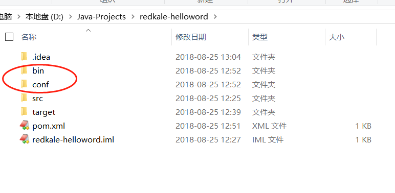 然后将redkale下的bin和conf文件夹(可以通过github或者maven里redkale-1.9.5.tar.gz解压得到)复制到工程的目录下。